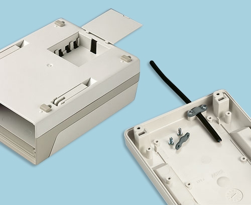 Electronic enclosure with a fine textured finish. The three-part snap together design can also be additionally secured with screws. PCB mounting bosses are located on top and bottom of enclosure. The front plate can slide in or can be screwed onto the front of the enclosure. Tilt feet provide the proper viewing angle.